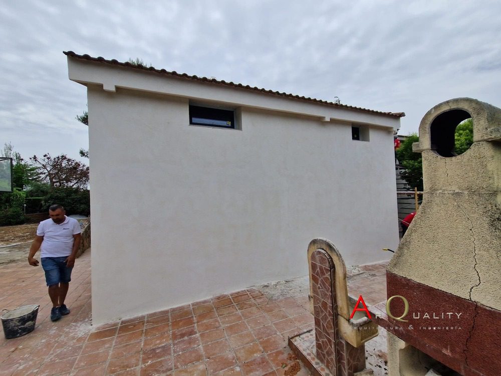 Tras el secado del mortero base, aplicamos un revestimiento acrílico de gran adherencia en color personalizado, resistente a los rayos UV y a las variaciones climáticas. Este acabado no solo aporta un aspecto renovado y elegante, sino que incluye tratamientos hidrófugos que repelen el agua y evitan la proliferación de microorganismos en la superficie.