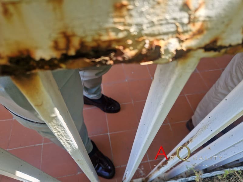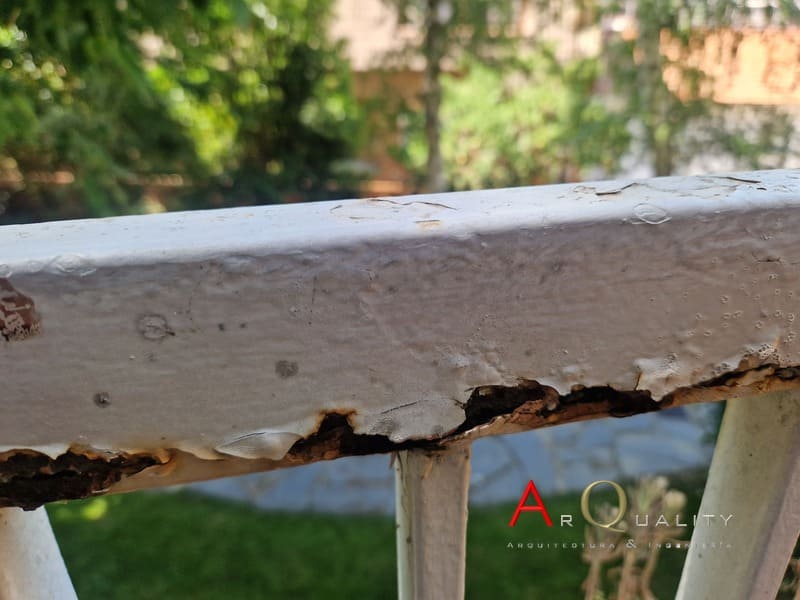 Al acceder a la terraza descubrimos un barandal de hierro con restos de pintura descascarada y ferralla evidente, que comprometía la firmeza y la estética de la barandilla. Iniciamos el proyecto retirando cuidadosamente cada módulo, protegiendo el forjado y reservando los anclajes originales para su posible reutilización o refuerzo.