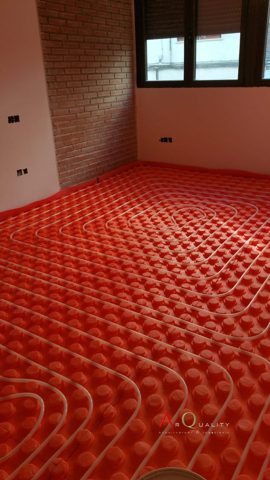 Uno de los elementos clave de esta obra fue la incorporación de un sistema de aerotermia con distribución por suelo radiante. Se instaló una red de tuberías sobre panel aislante alveolar rojo, lo que garantiza una distribución térmica eficiente y homogénea. Esta solución, además de sostenible, ofrece un alto confort durante todo el año y reduce el consumo energético de la vivienda.