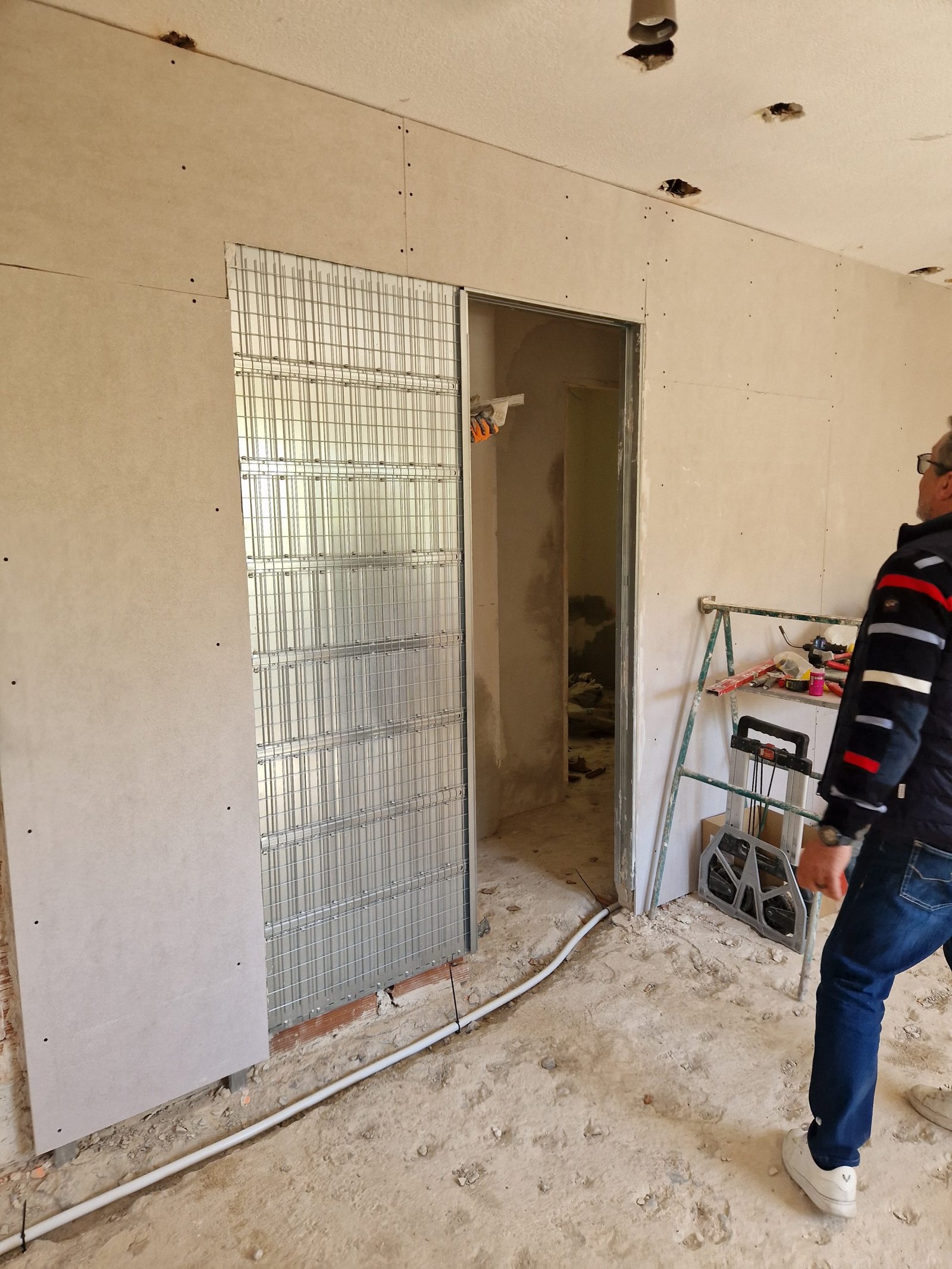 Ya estamos trabajando también en los falsos techos. Utilizamos placas de pladur sobre estructura metálica para crear techos limpios, rectos y listos para recibir iluminación técnica. Gracias a esto, integramos focos LED empotrados sin romper la estética del espacio. Este detalle no solo mejora la iluminación general de la vivienda, sino que también facilita futuras intervenciones técnicas o instalaciones ocultas.