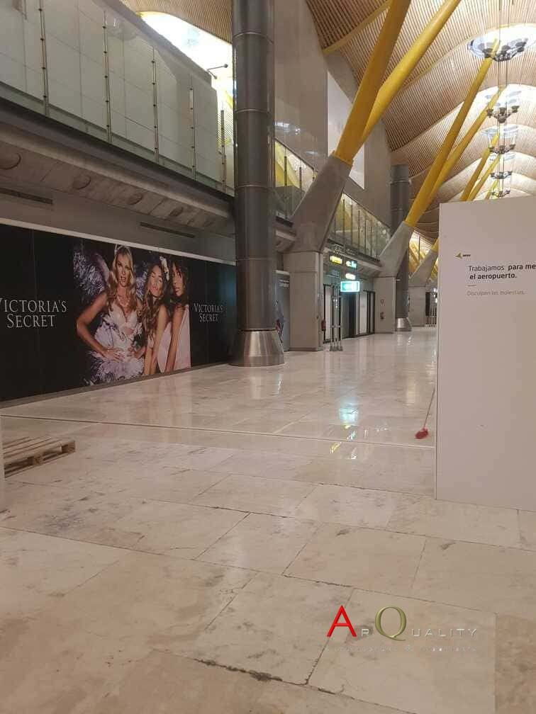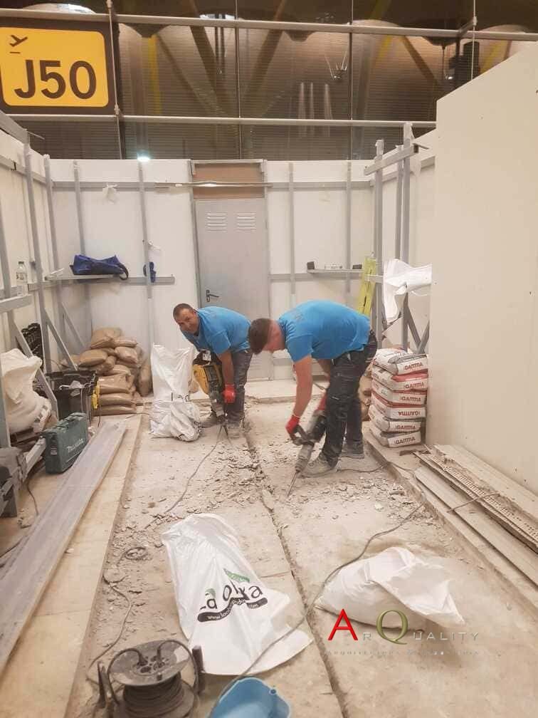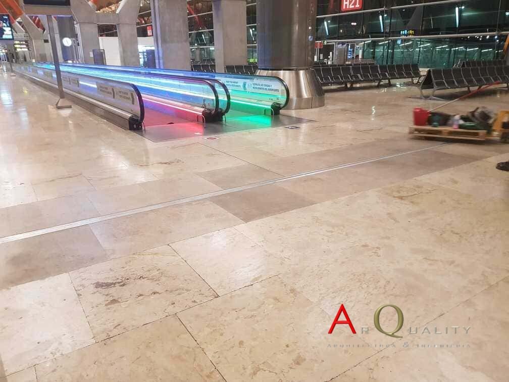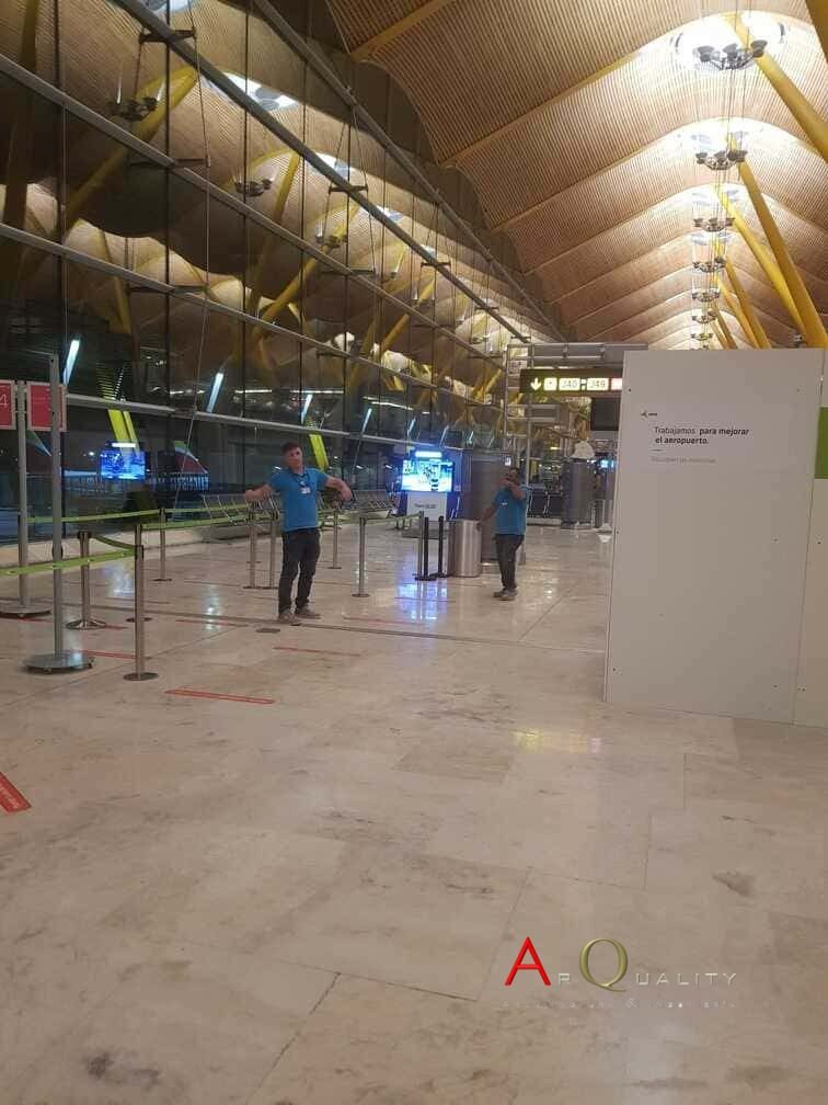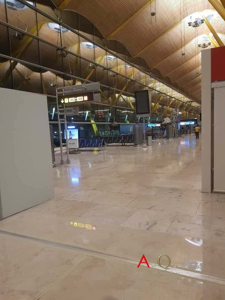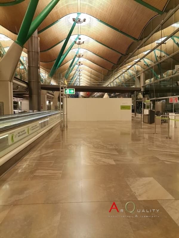 En Arquality asumimos en 2022 un proyecto de gran envergadura en la Terminal T4 del Aeropuerto de Barajas, con un presupuesto global de 3 millones de euros. Nuestra intervención incluyó la instalación de una junta longitudinal especial a lo largo de 1,5 km de pasillos, la reforma completa de los baños, mantenimiento de cubiertas, renovación de rejillas de ventilación, actualización de la red de fontanería y trabajos de cerrajería.