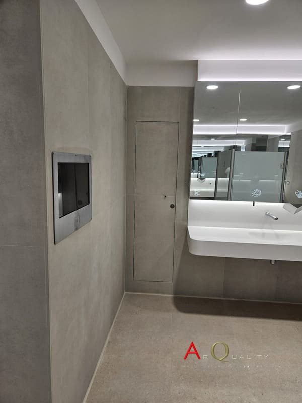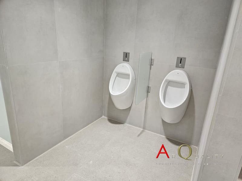 Los aseos de la T4 fueron sometidos a una renovación completa: demolición de soleras y alicatados antiguos, replanteo de nuevos módulos de lavabos solid surface y sanitarios empotrados, colocación de grifería monomando con sistemas automáticos, y revestimiento cerámico de gran formato en tonos neutros. El resultado es un espacio higiénico, accesible y de fácil mantenimiento, adaptado al flujo masivo de viajeros.