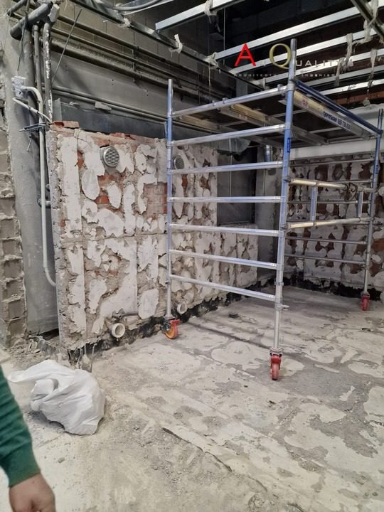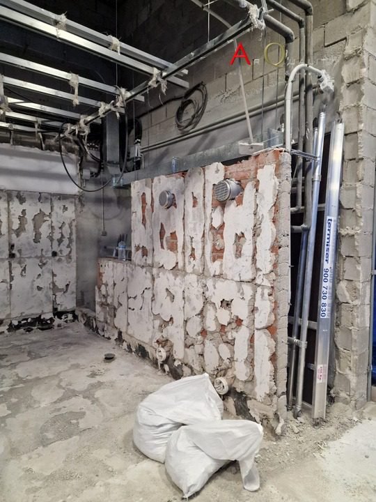 La primera fase del proyecto incluyó el desmontaje completo de la instalación de hostelería: barra, cocina, salida de humos, conductos de climatización, iluminación empotrada y revestimientos específicos del uso anterior. Se retiraron también los falsos techos y cerramientos no estructurales, preparando el espacio para su redistribución funcional como oficina.