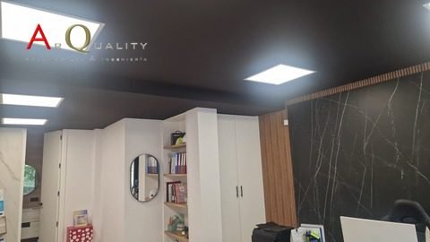 La reforma contempló una renovación completa de la instalación eléctrica, con nuevos puntos de luz, tomas de red y mecanismos empotrados. Se instaló también climatización tipo split con unidad exterior y difusores interiores integrados. La nueva distribución permite un uso eficiente del espacio con zonas independientes de trabajo, sala de reuniones y área de recepción.