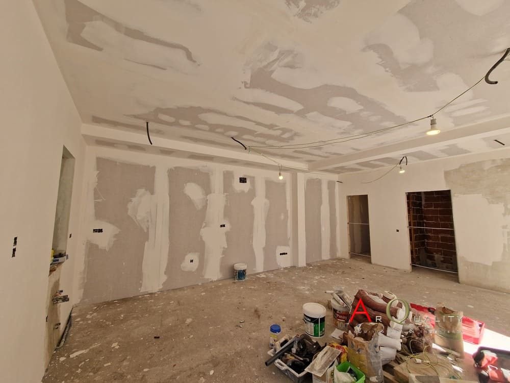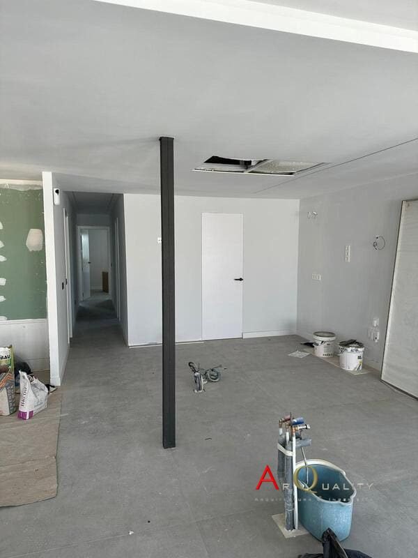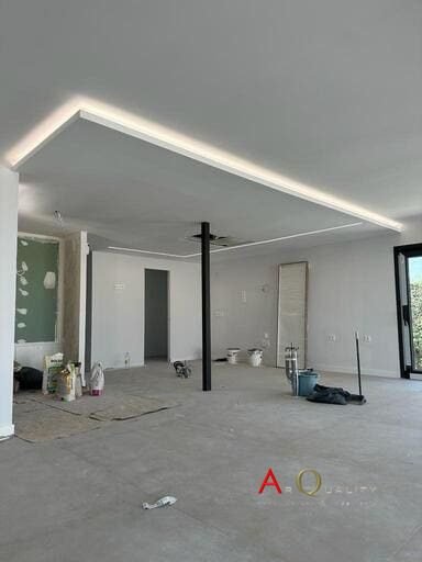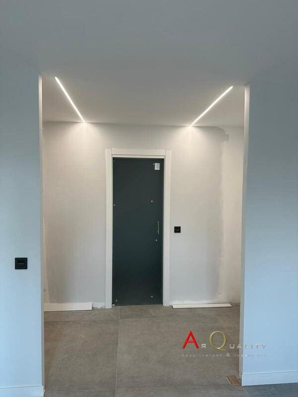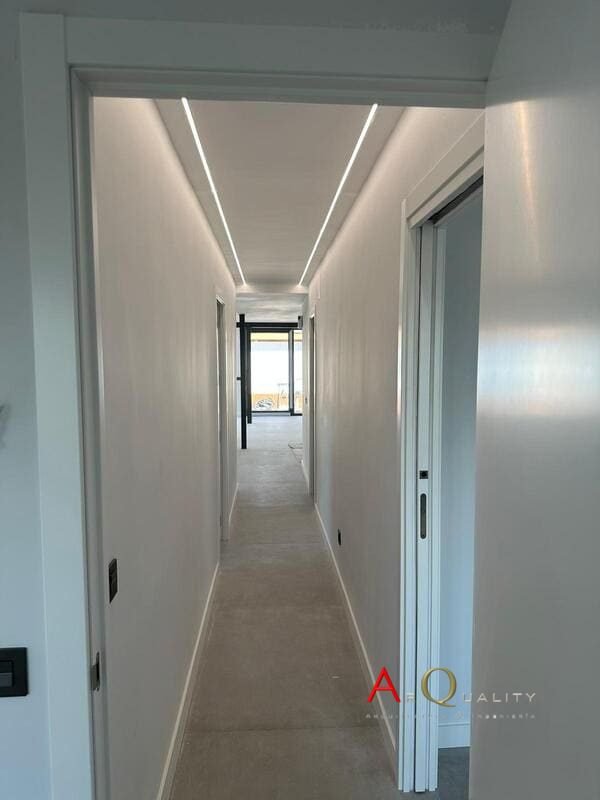 Ya se han realizado los falsos techos de pladur en salón y pasillos, con iluminación LED perimetral empotrada en foseados y distribución de puntos de luz central. Las paredes están enlucidas y preparadas para primera mano de pintura. El suelo aún se encuentra en bruto a la espera de ejecución de capa final de pavimento continuo o tarima.