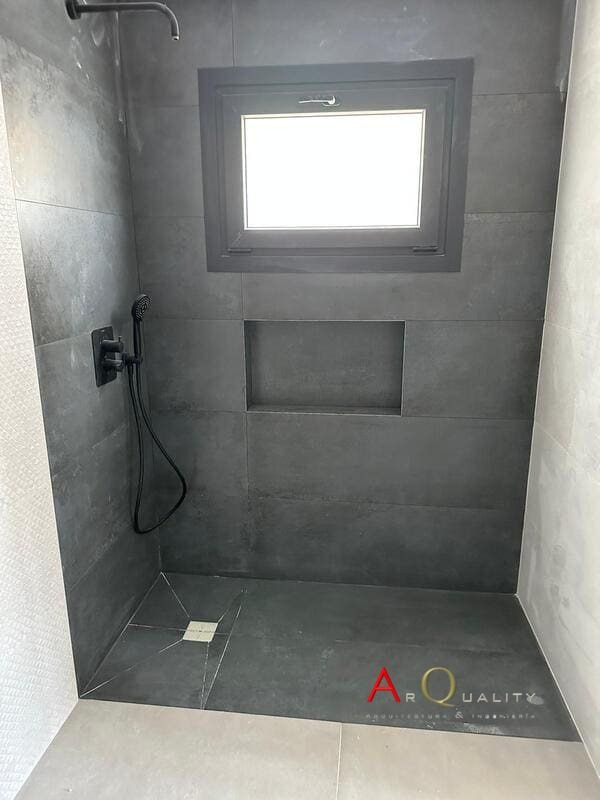 En uno de los baños se han colocado ya revestimientos cerámicos tipo piedra en tonos grises, así como sanitarios provisionales. Otro baño presenta aplacado porcelánico imitación madera en paredes y espacio de ducha. La ejecución muestra platos de ducha extraplanos y previsión de mamparas en cristal templado.