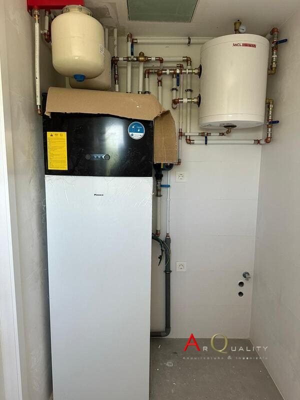 Se han instalado líneas de alimentación hidráulica para sistema de aerotermia, así como acumuladores de ACS, válvulas mezcladoras y colectores en una sala técnica compacta. La red de fontanería y climatización está ya canalizada, con previsión de suelo radiante en varias zonas. Las preinstalaciones eléctricas y de telecomunicaciones están en curso.