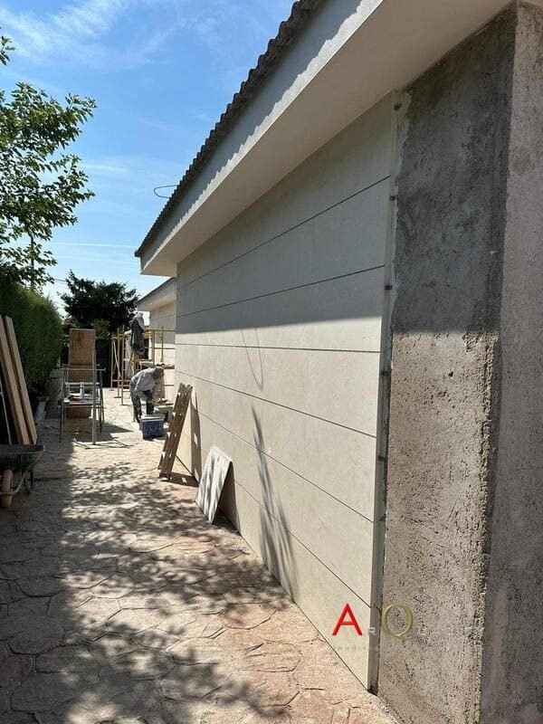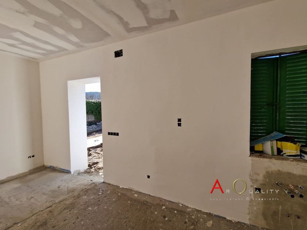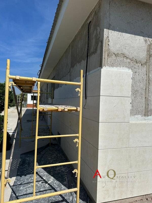 La fachada original ha sido completamente picada y se encuentra en fase de preparación para aplicar un sistema SATE (aislamiento térmico por el exterior), con base de anclaje y malla ya parcialmente instalada. Se prevé revestimiento final en mortero acrílico texturizado, en tonos claros, adecuado para la climatología serrana y normativas de eficiencia energética.