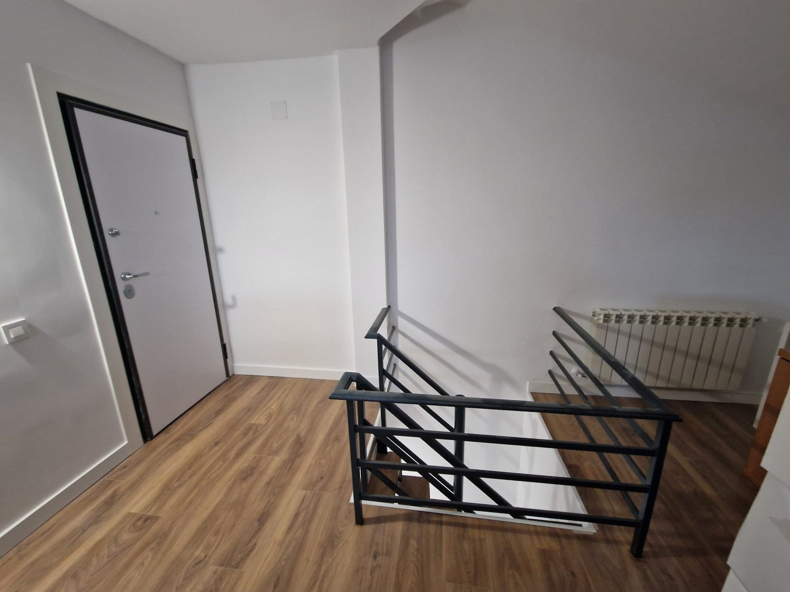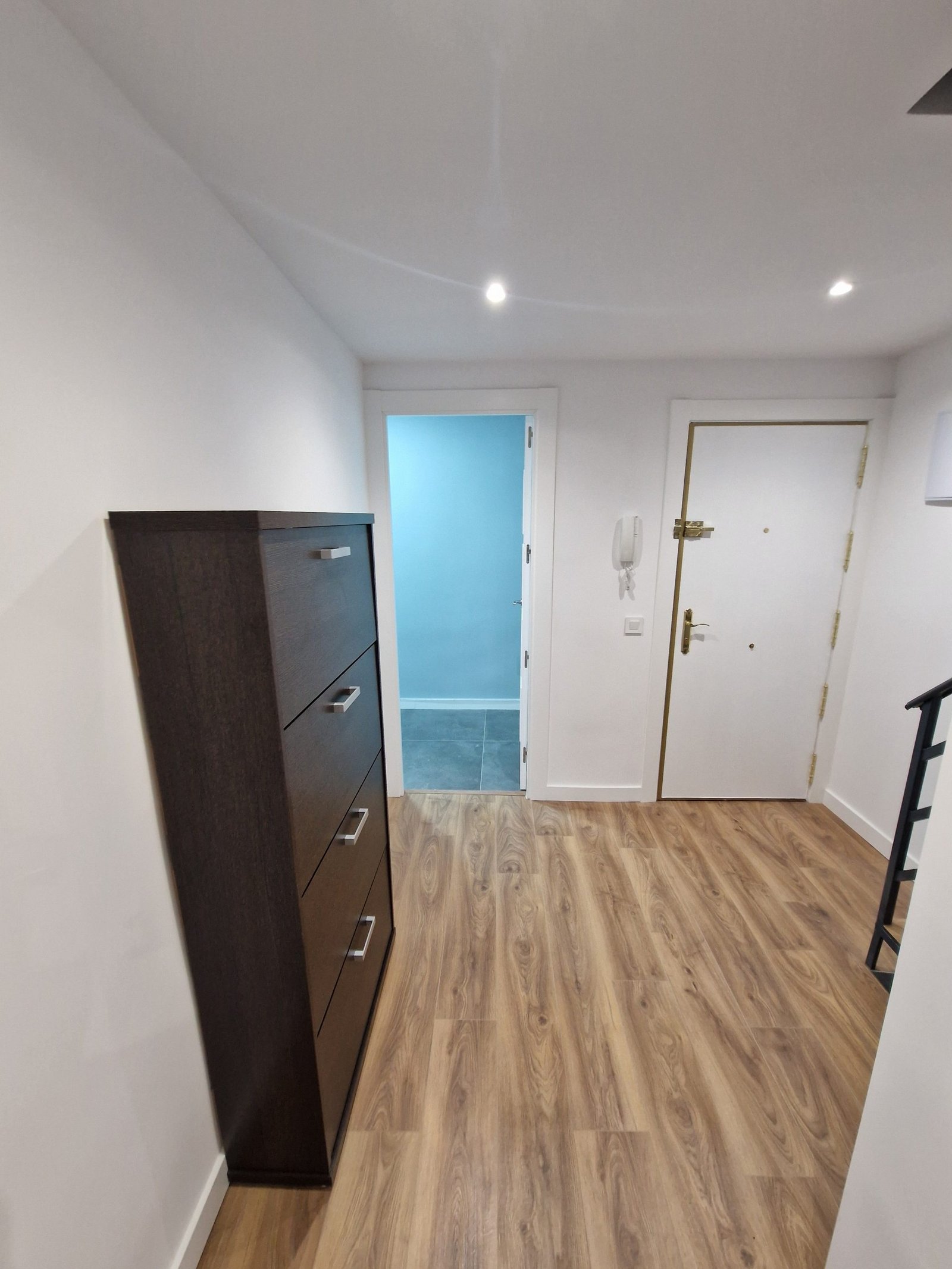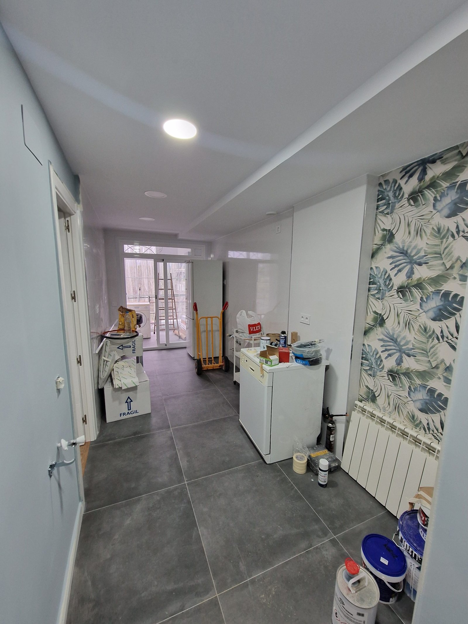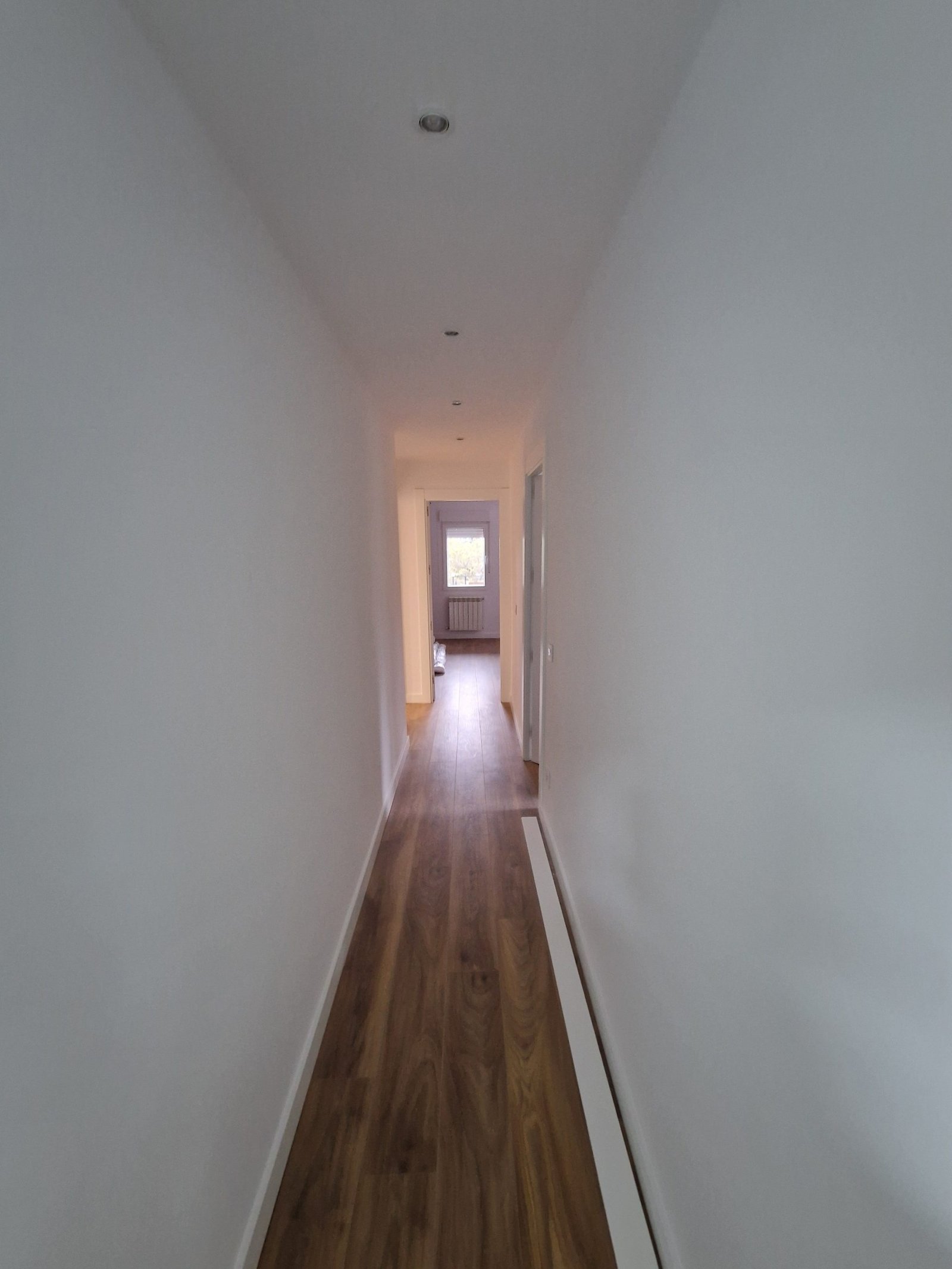 Finalmente, paredes y techos recibieron pintura plástica mate de alta lavabilidad en color blanco roto, aportando un acabado limpio y duradero que realza la sensación de amplitud y luminosidad.