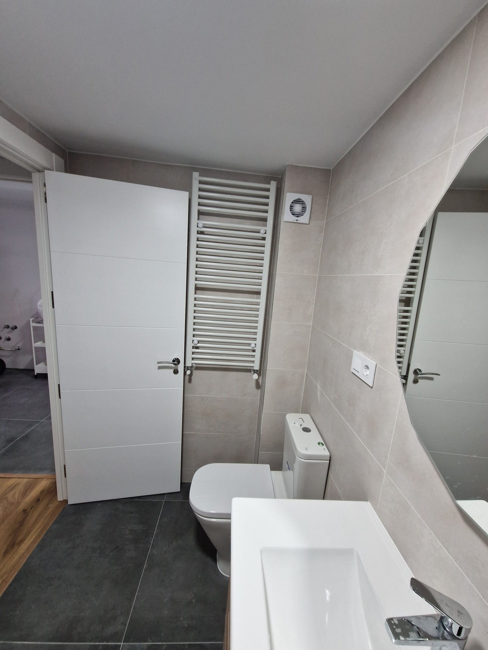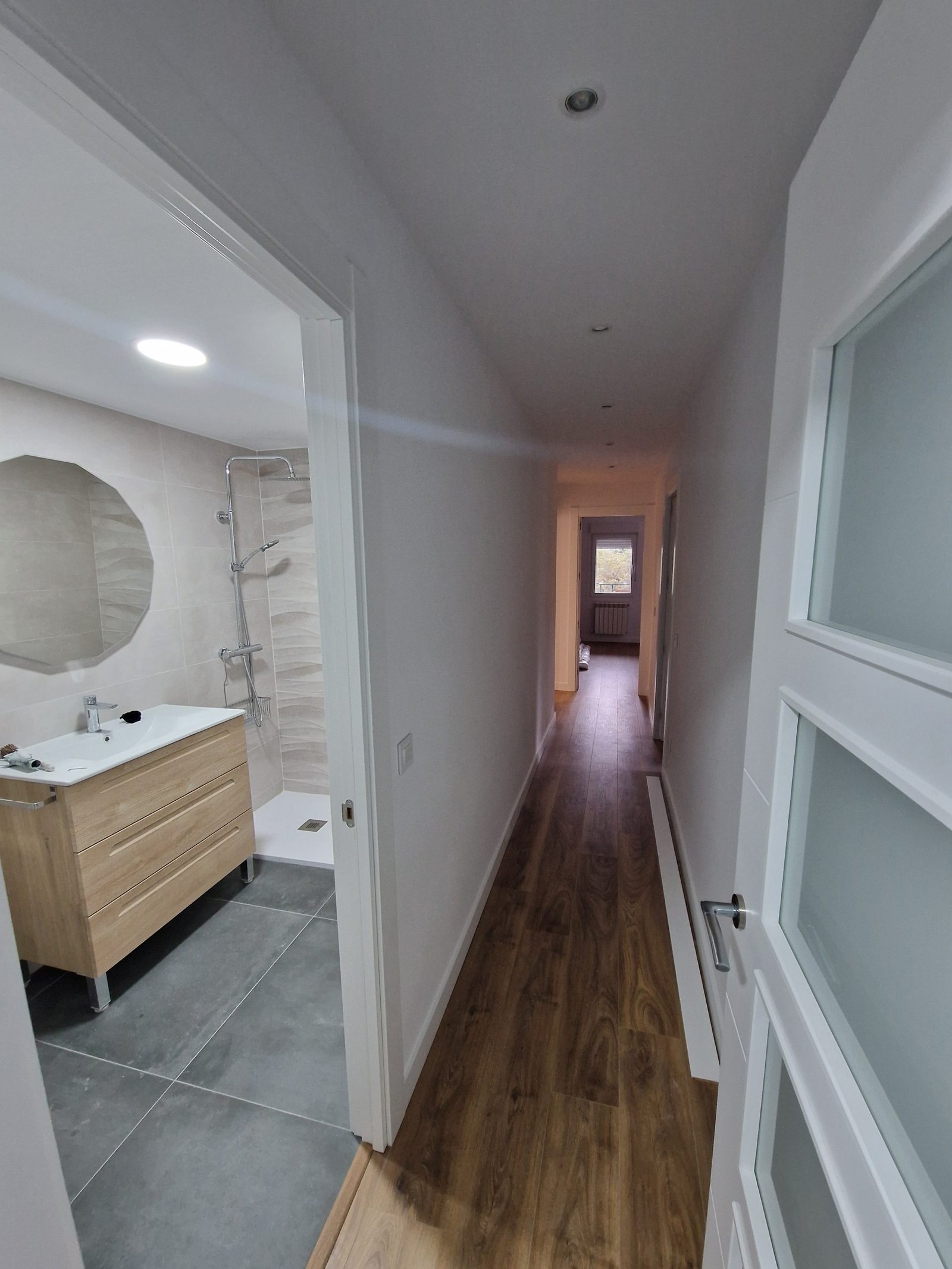 El salón y el dormitorio principal lucen un pavimento laminado AC5 imitación roble medio, mientras que el baño incorpora un alicatado de porcelánico mate de gran formato y listelos decorativos “Wave”. El mueble de baño suspendido en roble natural, con lavabo cerámico y espejo facetado poligonal, y el módulo bajo TV en melamina blanca con chapa de nogal, completan la estética contemporánea.
