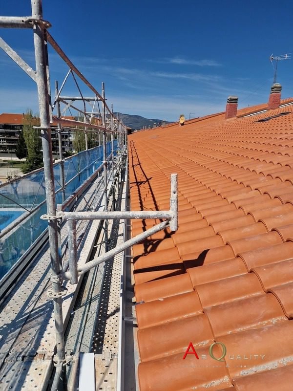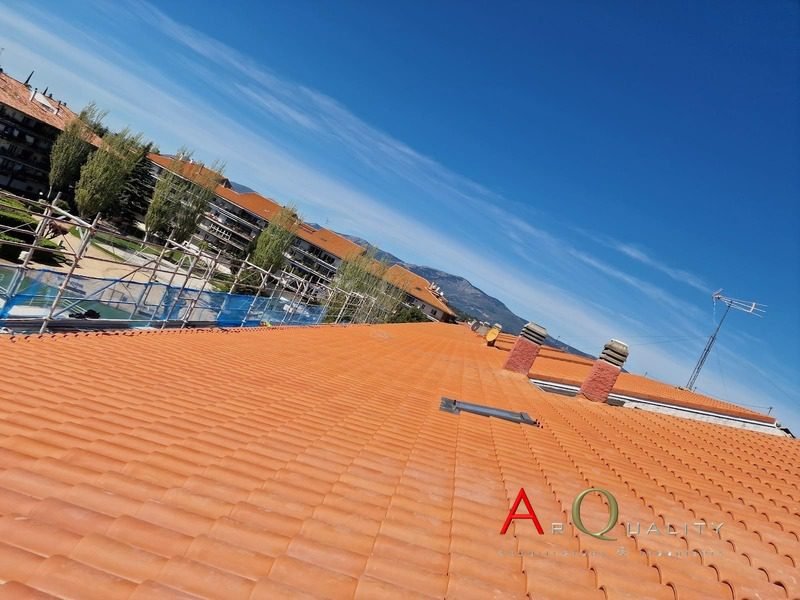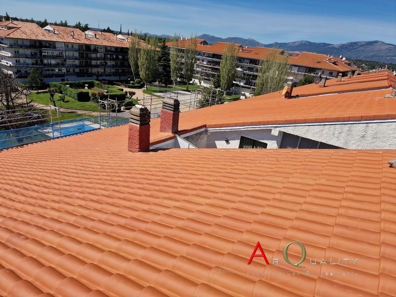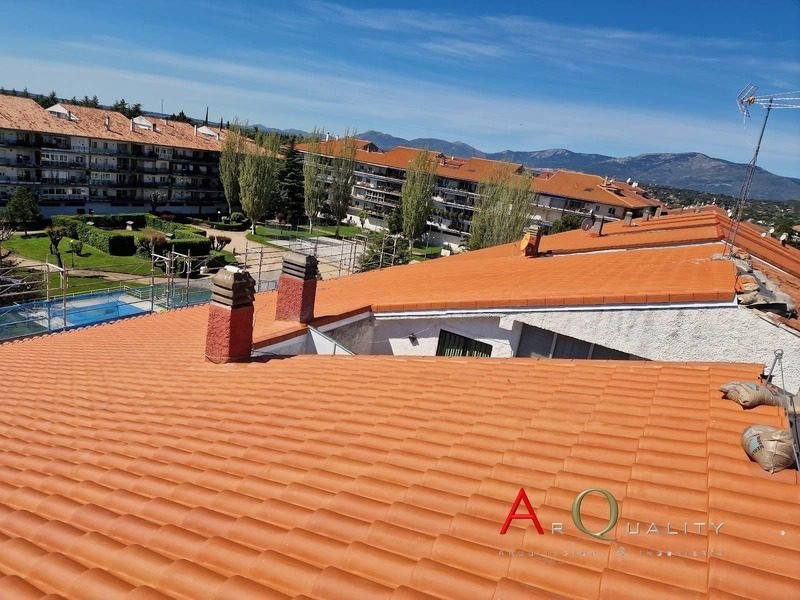 El acabado final de la cubierta se realizó mediante la instalación de teja cerámica curva en color rojo teja, un modelo tradicional ampliamente utilizado en entornos residenciales de la sierra madrileña. Este tipo de acabado permite conservar la estética del conjunto urbano al tiempo que mejora significativamente la durabilidad del tejado.