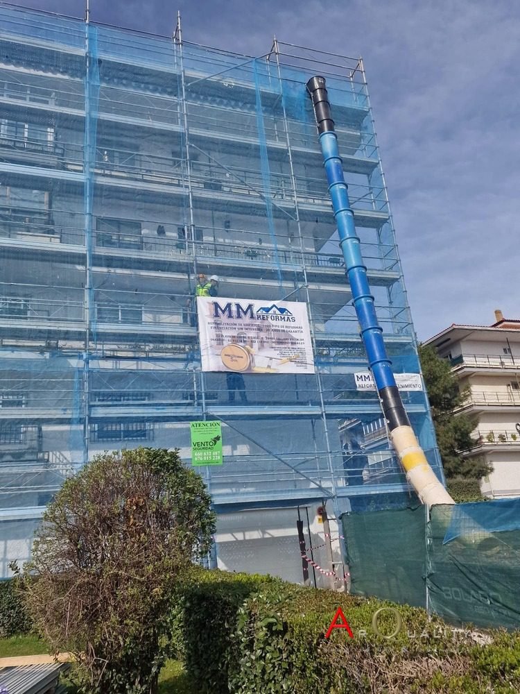 Toda la obra fue ejecutada con medios auxiliares adecuados, incluyendo andamiaje perimetral, barandillas y elementos de protección colectiva. Se aplicaron protocolos de seguridad para trabajos en cubierta inclinada, además de la gestión ordenada de residuos mediante bajantes verticales para evacuación de escombros.