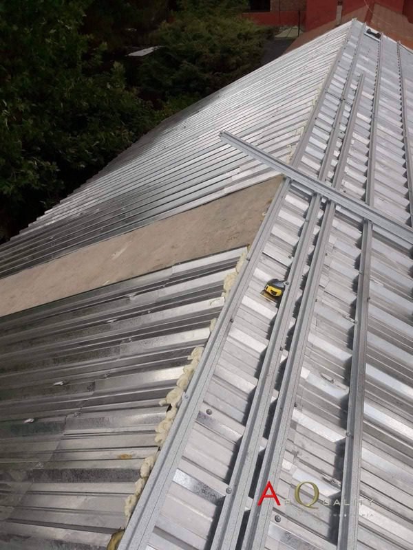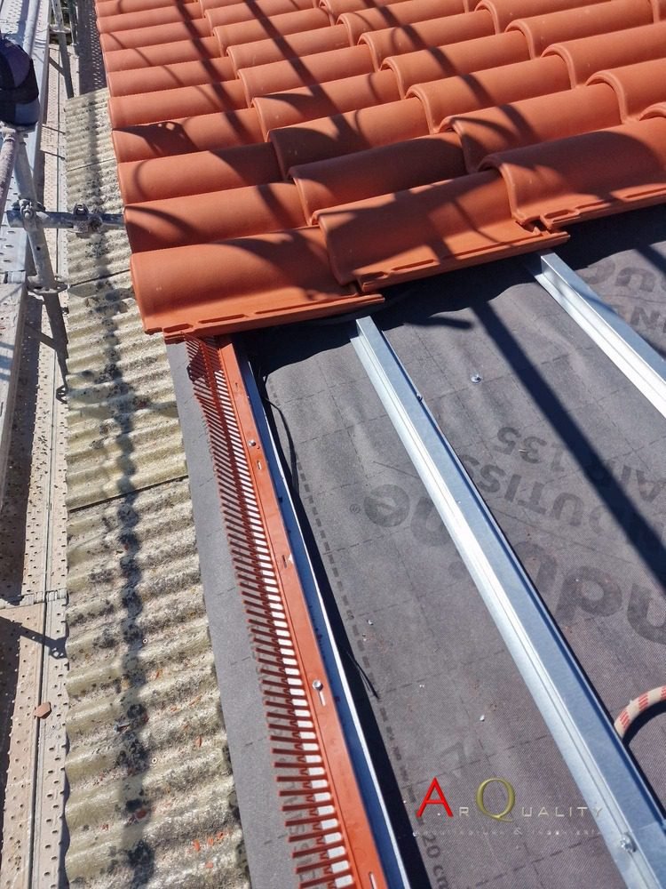 Una vez retirado el revestimiento original, se procedió a la colocación de nuevos elementos estructurales de soporte, adaptados a la pendiente existente y al tipo de teja seleccionada. Se incluyó un aislamiento térmico de alta densidad entre rastreles para garantizar un mejor rendimiento energético en las viviendas situadas bajo cubierta.