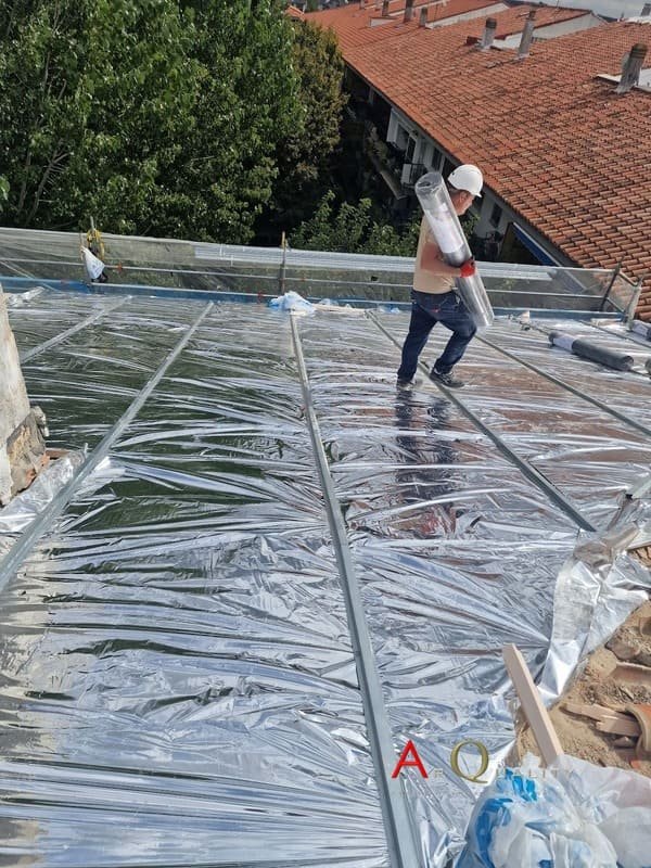 Una vez preparada la base estructural, se colocó un sistema de aislamiento reflectante multicapa con lámina de aluminio de alta reflectividad, lo que permite mejorar significativamente la eficiencia térmica de la cubierta. Este sistema actúa como barrera térmica y contribuye al confort interior de las viviendas durante todo el año.
