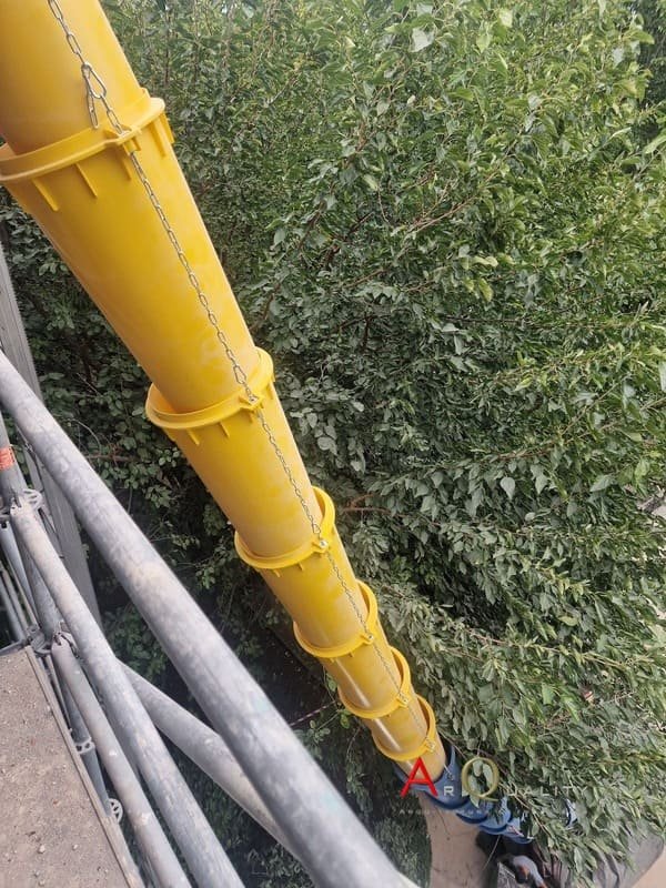 Durante toda la ejecución se mantuvieron estrictas medidas de seguridad, incluyendo andamiaje perimetral con redes protectoras, líneas de vida y canalización de residuos mediante bajantes. Estas medidas permitieron una intervención segura, eficiente y sin interrupciones para la comunidad.