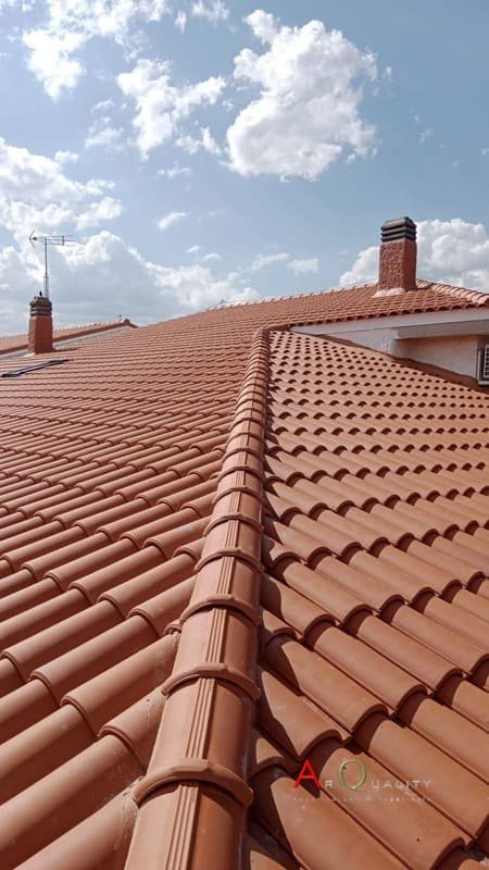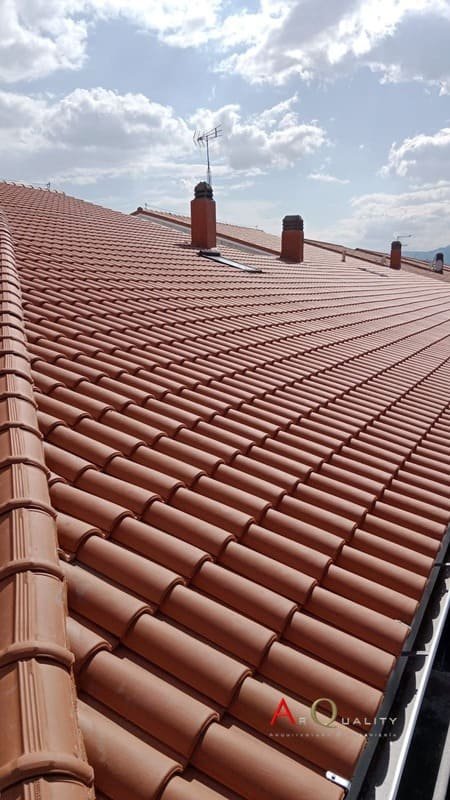 El acabado final se resolvió con teja cerámica curva nueva en color rojo natural, instalada sobre rastreles metálicos con fijación mecánica. Este sistema garantiza una ventilación adecuada de la cubierta y una fijación segura frente a vientos y cambios de temperatura. El resultado final mantiene la estética tradicional del entorno y mejora la durabilidad general del tejado.