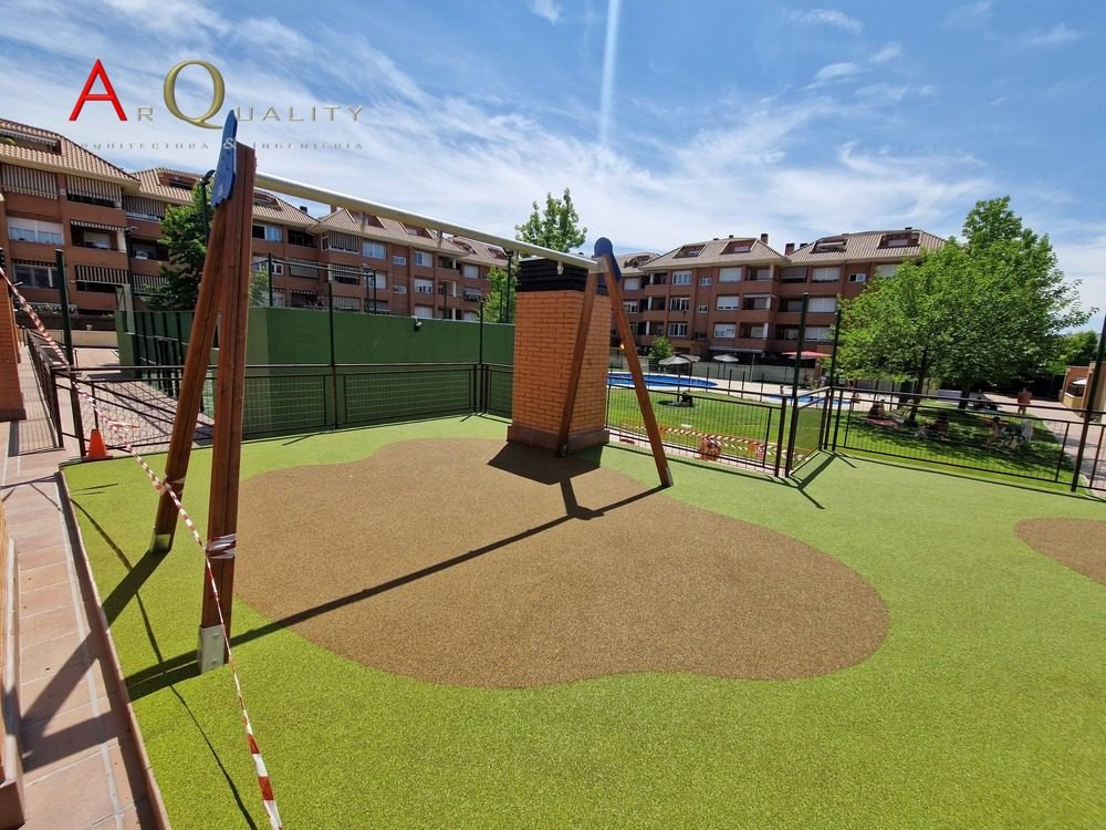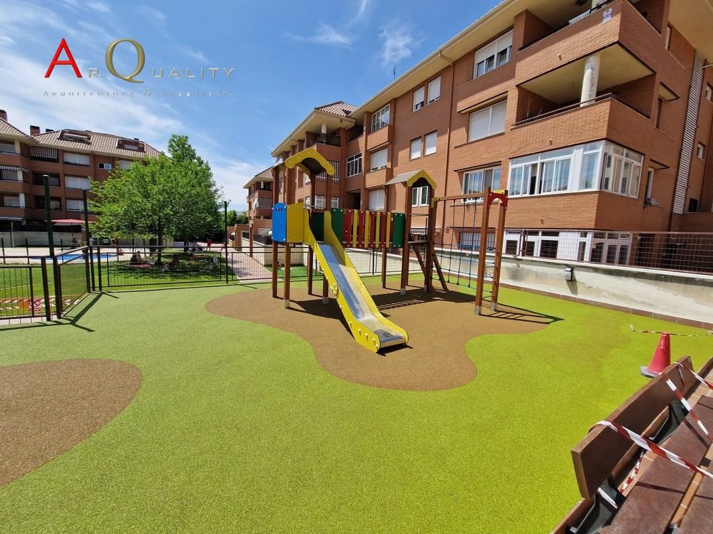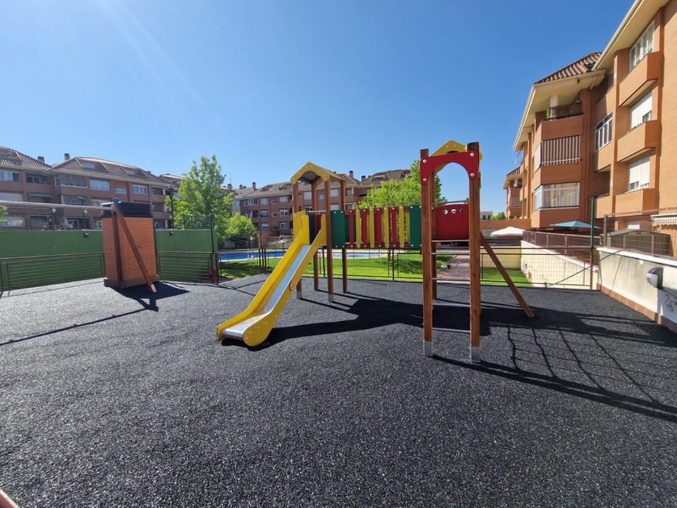 Rediseñamos los parterres con sistema de riego por goteo y especies autóctonas de bajo mantenimiento. En la zona de juegos infantiles, instalamos pavimento de caucho continuo en color verde y marrón, integrando un conjunto de columpios y toboganes homologados con anclajes electrosoldados y protecciones antivandálicas.