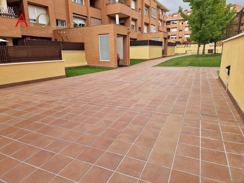 Retiramos el solado existente para aplicar una membrana de poliuretano bicomponente de alta durabilidad, garantizando la estanqueidad del garaje subterráneo. Incorporamos canalones lineales de acero inoxidable y sumideros de gran caudal para evacuar aguas pluviales sin riesgo de filtraciones.